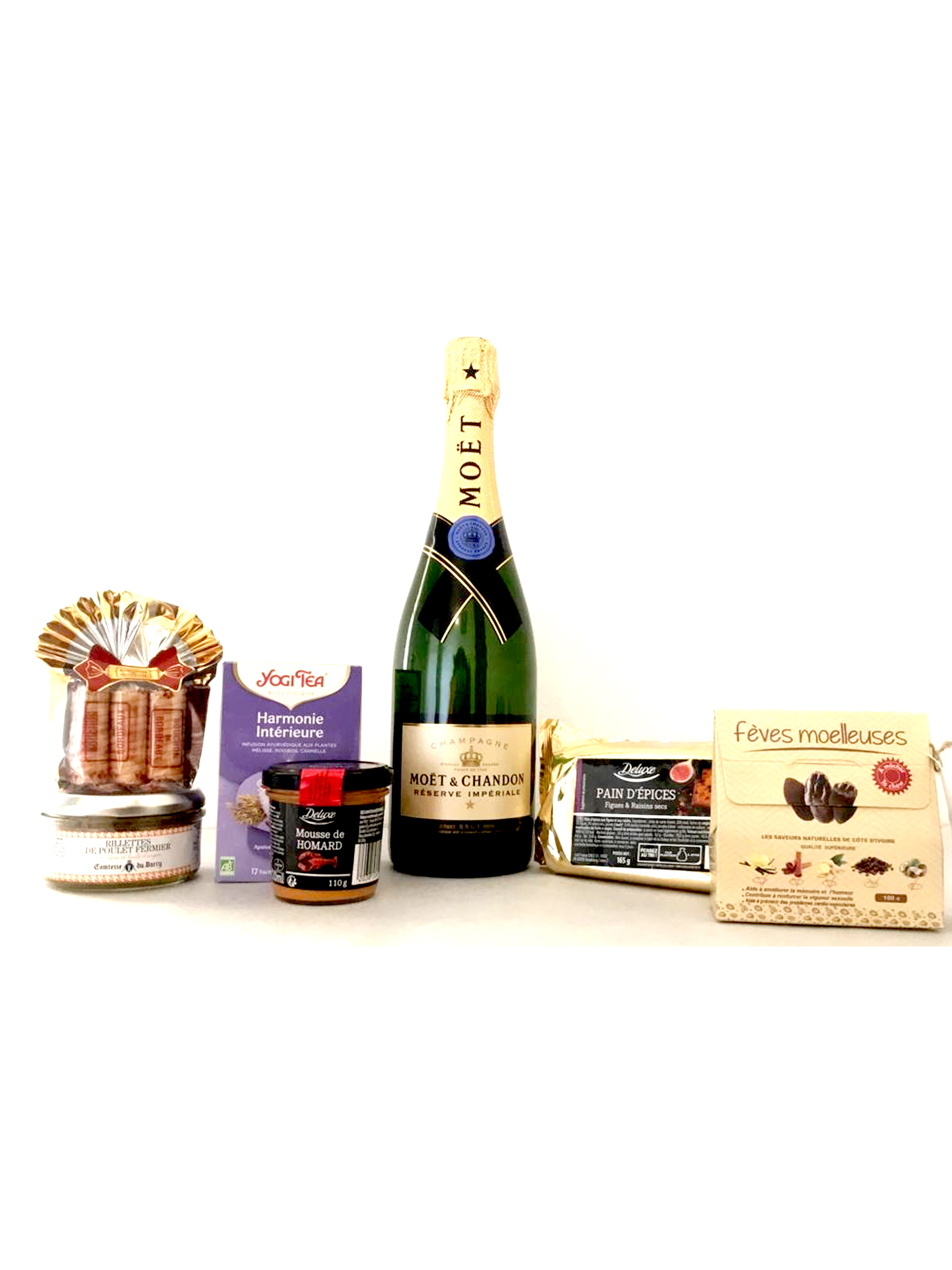 1 bouteille de Champagne 2 terrines 1 ballotin de tchocolat 1 flacon d huile d'olive 1 boîte de thé 1 boîte de biscuits Bouchons de Bordeaux ou Bonbons en papillote ou 1 Bougie parfumée